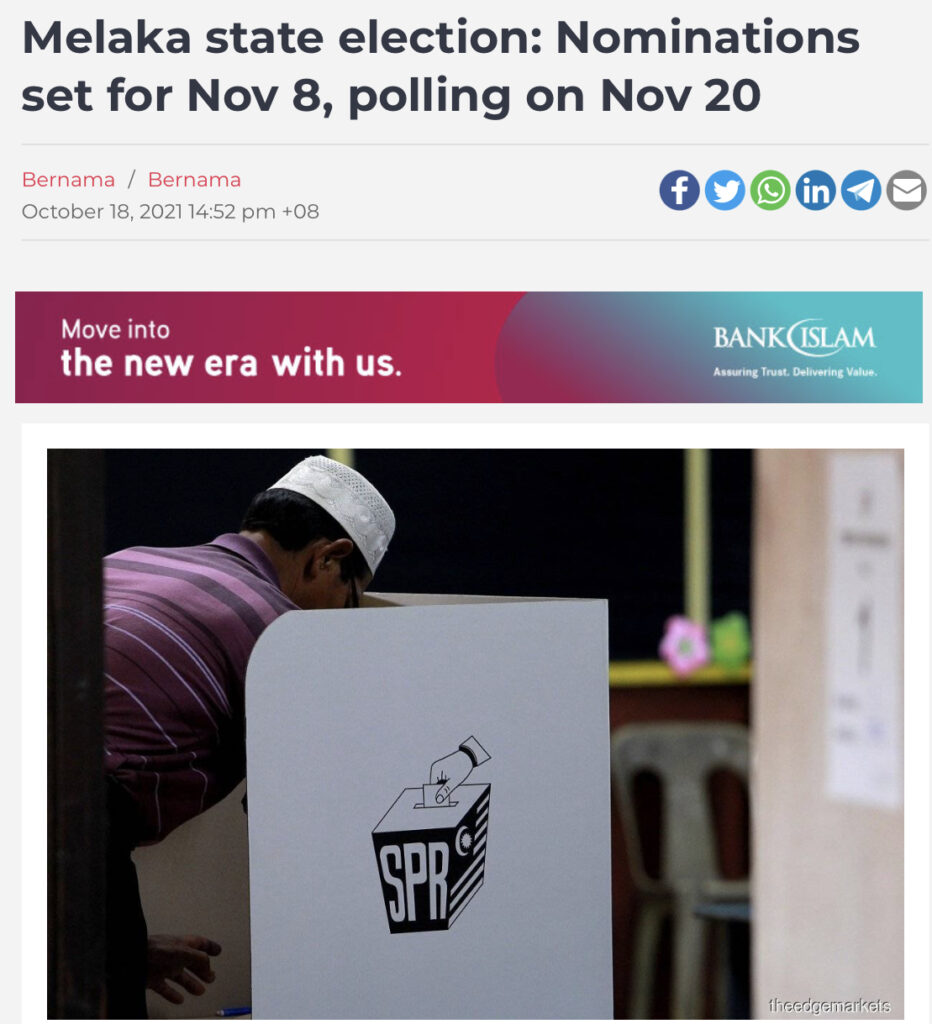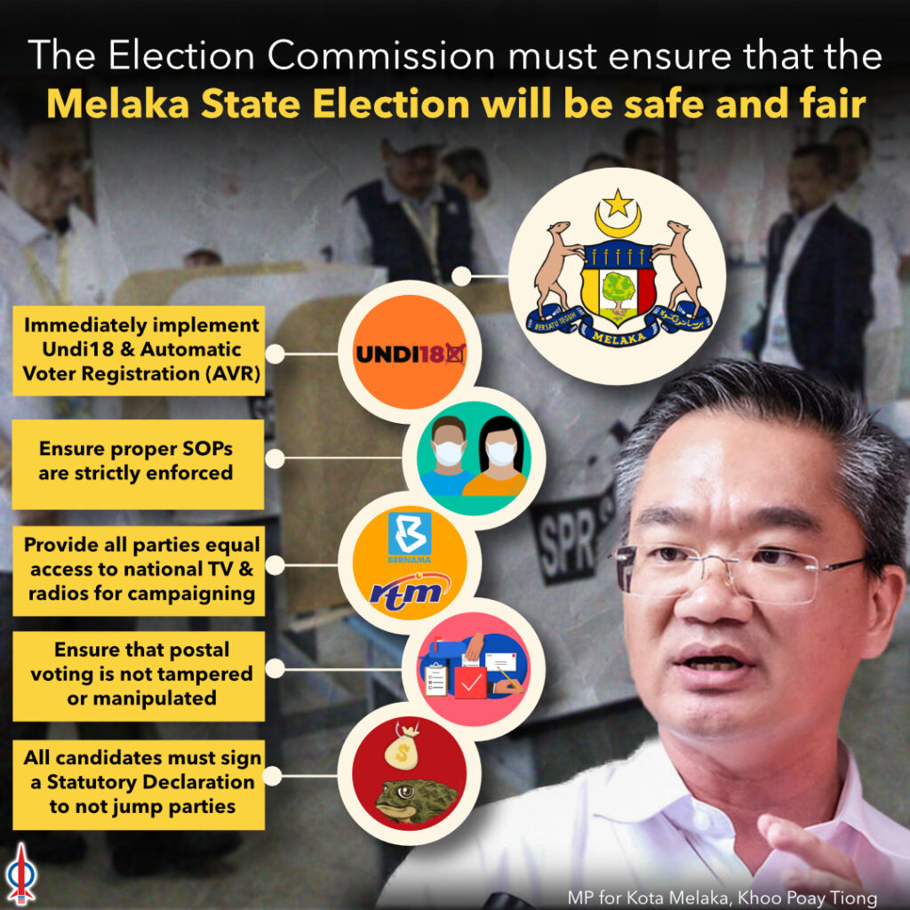 Following the announcement by the Election Commission (EC) that the polling day for the Melaka State Election will be held this 20 November 2021, the Member of Parliament (MP) for Kota Melaka Khoo Poay Tiong has urged the EC to take necessary measures in ensuring the election will be safe and fair. In a statement today, Khoo lamented the situation that the state of Melaka and its people have found themselves in due to the political games being played by four state assemblypersons from UMNO and Bersatu.