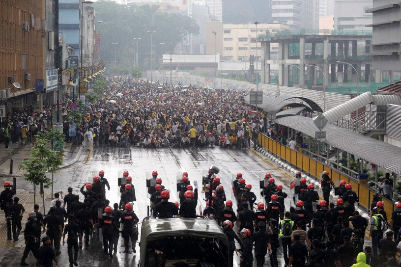 Some in the crowd must have had memories of the first Bersih in 2007, though, and word was soon going around to prepare for tear gas. Not long after, the crowd was abuzz with the news that the water cannon trucks were in place. We all knew what this meant: we were about to be attacked by our very own police force.