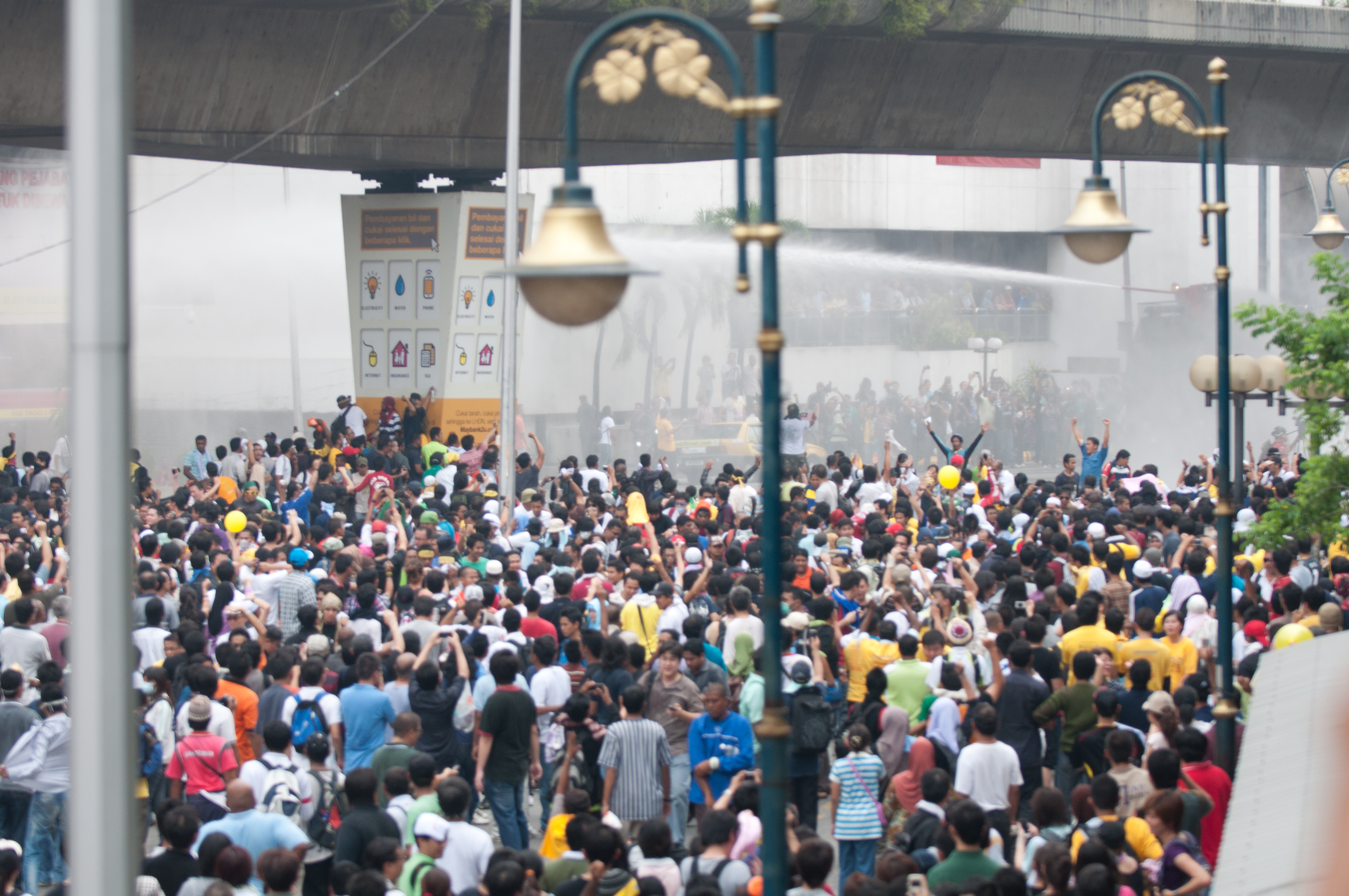 When the first sprays of the water cannons filled the street, people still cheered. Some even called out good naturedly “Mandi Bersih!” in response to the police’s unprovoked use of the chemical-laced water.