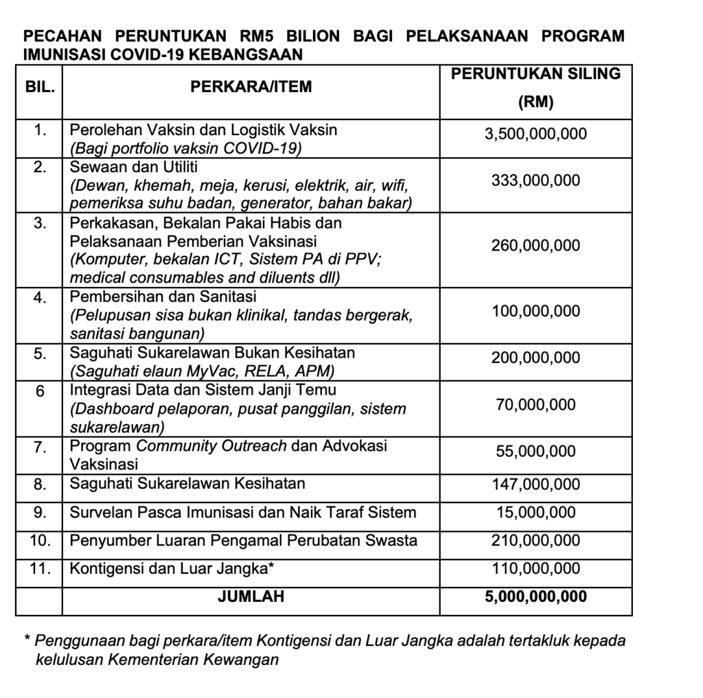 The Immunisation Minister on 27 April 2021 gave a breakdown of how the RM 5 billion will be spent with the breakdown of which RM 3.5 billion on procurement of portfolio of vaccines and RM 1.5 billion for the supporting administrative expenses (image 1).