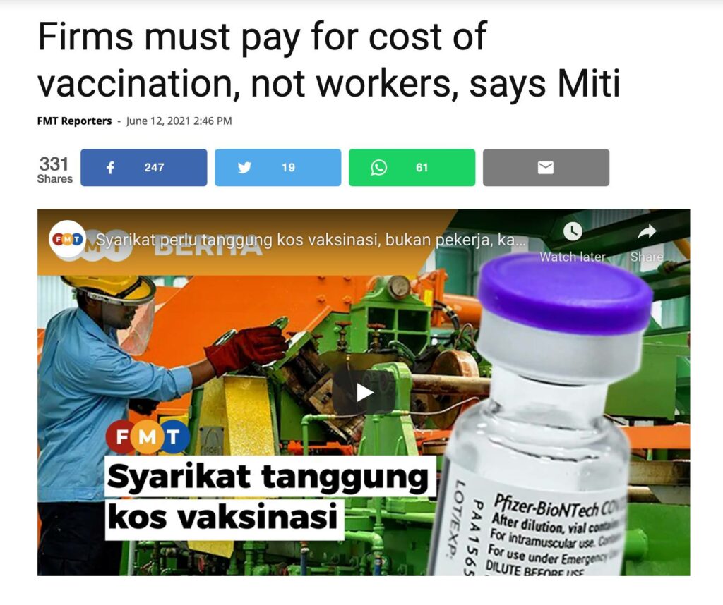 However, as Phase 4 starts, employers are asked to pay for the vaccination administration fees. While many employers may not mind to foot the bill, as long as it ensures faster opening of operation for them. What about those who can’t afford as their businesses are badly hit by Covid-19?