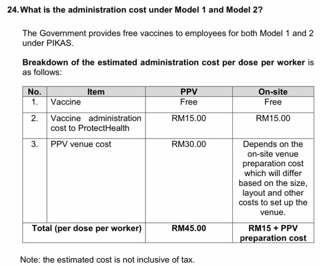 Yesterday Minister of International Trade and Industry Azmin Ali announced Program Imunisasi Industri Covid-19 Kerjasama Awam-Swasta (PIKAS) for Phase 4, of which the administrative cost per vaccine dose for each worker is RM45 if it is done at the PPVs, while on-site vaccination cost is estimated at more than RM15 plus venue cost, all to be paid by employers. See images below for reference.