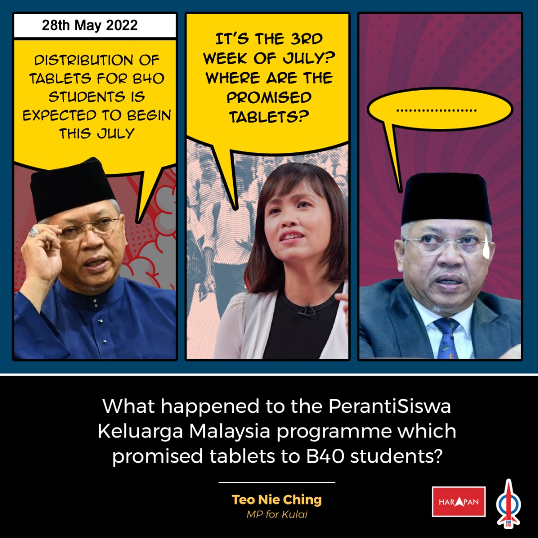 The Government in Budget 2021 allocated RM150 million to provide laptops to 150,000 students. Why then downgrade this in Budget 2022 to providing tablets to university students but continue to give laptops to primary and secondary school students? What’s the rationale behind such a decision?