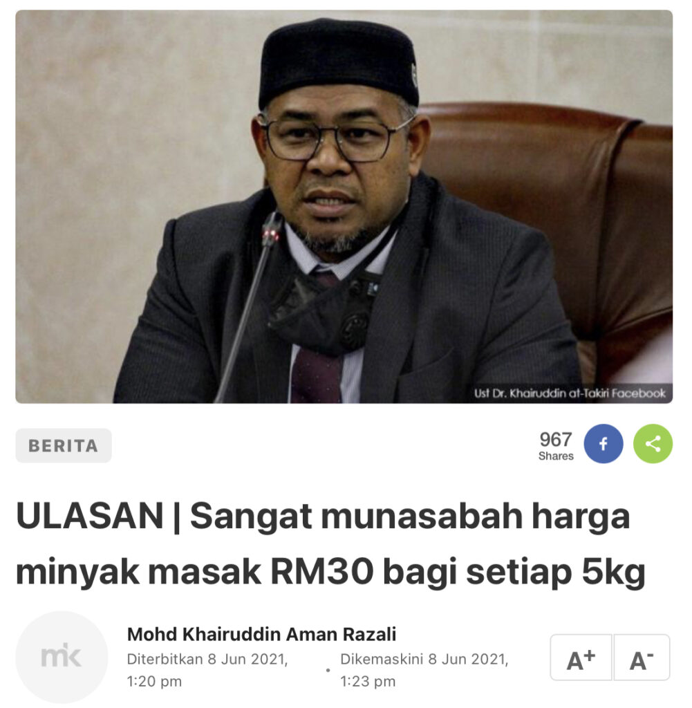 Recently, the increase of cooking oil price resulted by the hike of CPO price has become an issue among Malaysian consumers with many criticising PN’s Minister of Plantation Industries, Dato’ Dr Mohd Khairuddin Aman Razali who claimed that the price hike is ‘reasonable’.