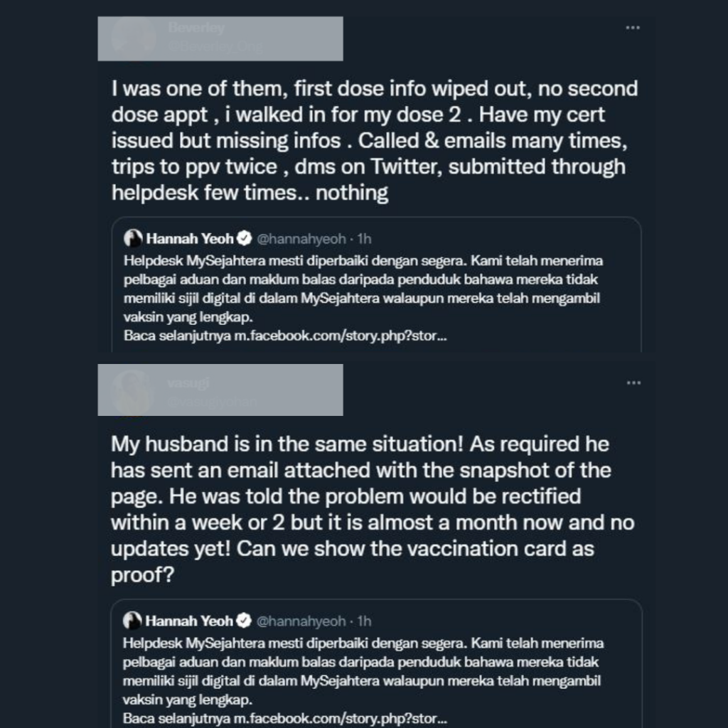 Ahli Parlimen Segambut, Hannah Yeoh berkata, banyak aduan diterima daripada penduduk berkenaan ketiadaan sijil digital dalam aplikasi My Sejahtera, sungguhpun mereka telah menerima vaksinasi lengkap.