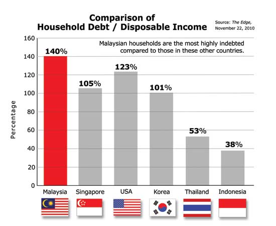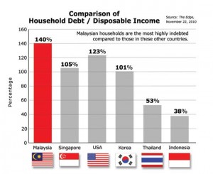 Abaikan fakta nombor dan angka itu, dalam erti kata lain, setiap isi rumah di Malaysia sekarang berhutang dan kebanyakannya melebihi daripada apa yang sepatutnya dan terjerat dalam hutang yang berpanjangan. Golongan berpendapatan rendah dan penjawat awam negara ini yang kini berada dalam nisbah hutang yang lebih tinggi sekali gus meningkatkan bebanan keseluruhan isi rumah. Awal tahun ini, ketika mengulas mengenai hutang isi rumah kepada KDNK, sesuatu yang lebih mengejutkan apabila dinyatakan satu daripada lima rakyat Malaysia tidak mempunyai simpanan (The Star, 27-02-2013).