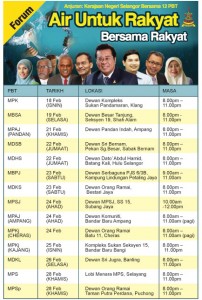 SHAH ALAM, 19 FEB: Pelbagai fitnah dan tomahan Barisan Nasional (BN) yang mengelirukan rakyat dengan memainkan isu air Selangor bakal terjawab menerusi siri jelajah Forum Air Untuk Rakyat 10 hari berturut-turut bermula semalam hingga 28 Februari ini.