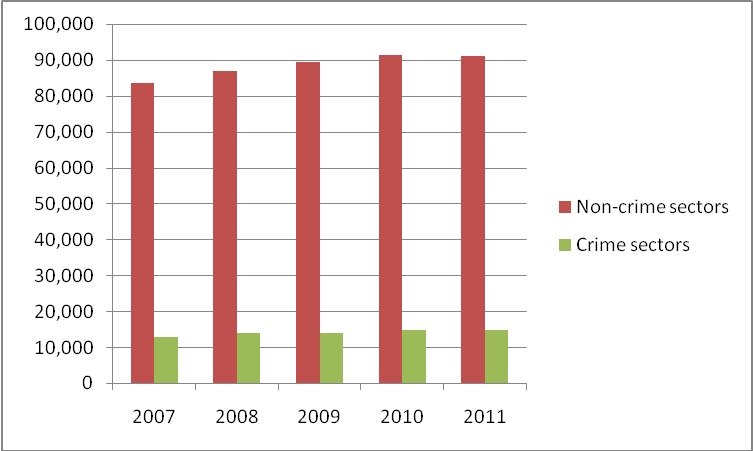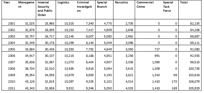 Secara keseluruhannya jika dijumlahkan kesemua jabatan yang berkaitan dengan jenayah, ia merangkumi 14 peratus dari 105,929 anggota polis meliputi bahagian narkotik dan jenayah komersial.