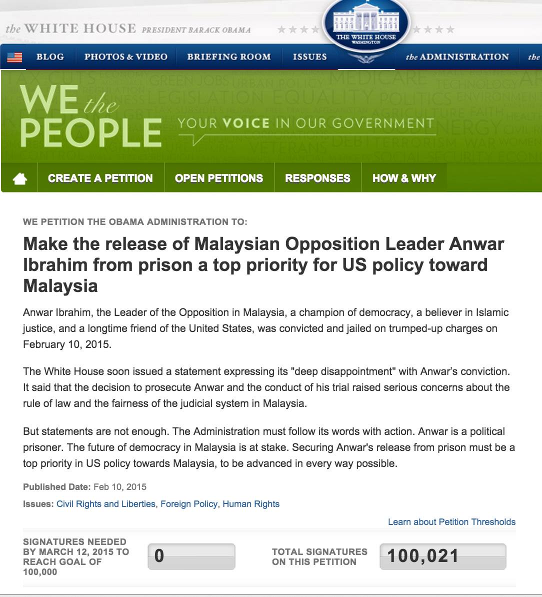 Petisyen pro-Anwar yang ghaib dari laman web White House muncul semula tengah malam semalam dan berjaya mengumpulkan lebih dari 100,000 tandatangan seperti yang disyaratkan.