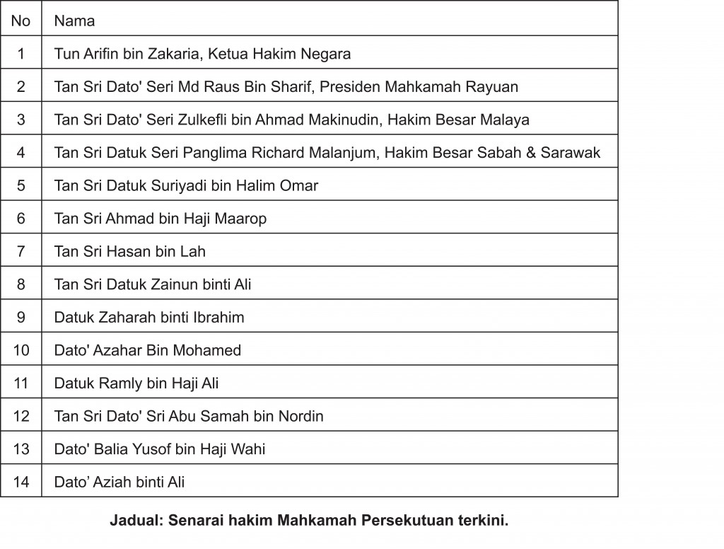 Oleh itu, adalah penting bahawa hakim-hakim yang membentuk Mahkamah Persekutuan mewakili demografi sosial yang rencam di negara kita. Malangnya, itu sama sekali tidak berlaku apabila kita meneliti senarai penuh 14 hakim Mahkamah Persekutuan ini, sebagaimana disenaraikan dalam jadual di bawah.