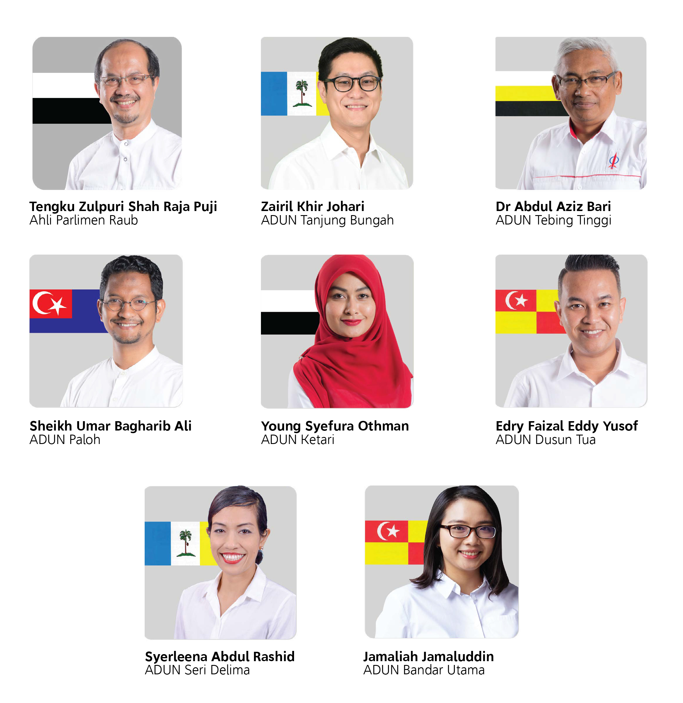 Mereka ialah Zairil Khir Johari (Tanjung Bungah), Syerleena Abdul Rashid (Seri Delima), Dr Abdul Aziz Bari (Tebing Tinggi), Jamaliah Jamaluddin (Bandar Utama), Edry Faizal (Dusun Tua), Norhizam Hassan Baktee (Pengkalan Batu) tetapi kini telah meninggalkan parti, Sheikh Omar Ali (Paloh), Young Syefura Othman atau Rara (Ketari), dan Abu Bakar Lebai Sudin (Pulau Manis).