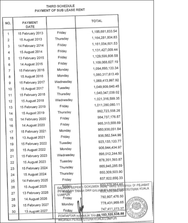 Menurutnya, bayaran itu meliputi sewa untuk 186 lot tanah dan dibuat menerusi pembayaran berperingkat sebanyak 30 kali selama 15 tahun bermula dari 15 Februari 2013 sehingga 13 Ogos 2027.