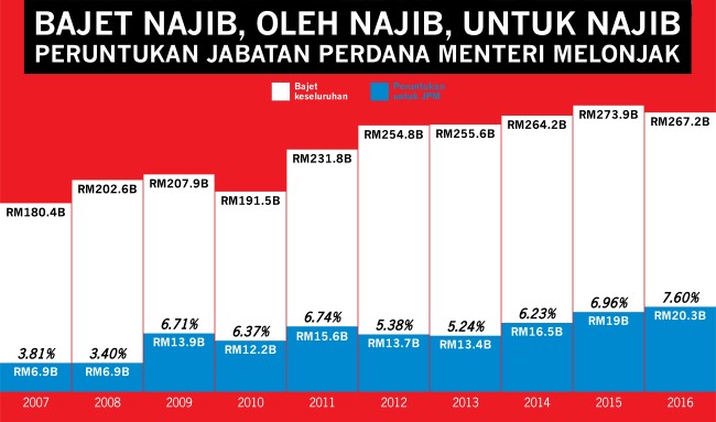 Sedangkan, peruntukan JPM melonjak hingga mencecah tujuh peratus daripada keseluruhan buat pertama kali dalam sejarah tanah air iaitu 7.6 peratus (2016) berbanding 6.96 peratus (2015), 6.23 peratus (2014), 5.24 peratus (2013), 5.38 peratus (2012), 6.74 peratus (2011), 6.37 peratus (2010) , 6.71 peratus (2009), 3.4 peratus (2008) dan 3.81 peratus (2007) . -Roketkini.com