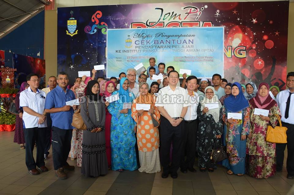 Cek bantuan sebanyak RM1,000 kepada pelajar dan wakil itu disempurnakan oleh Ketua Menteri Pulau Pinang Lim Guan Eng dalam majlis penyampaian cek bantuan di Dewan Terbuka, Tapak Pesta Sungai Nibong, semalam.
