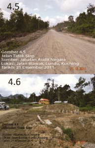 “Sehingga lawatan Audit pada 21 Disember 2011, projek ini belum siap dan dikategorikan sebagai projek sakit. Notis Penamatan Kontrak telah dikeluarkan kepada kontraktor pada 22 Februari 2012. Keadaan jalan dan jambatan bagi Projek Naik taraf Jalan Biawak yang tidak siap adalah seperti Gambar 4.5 dan Gambar 4.6 ”. Ini ayat-ayat dari teks laporan Ketua Audit sendiri.