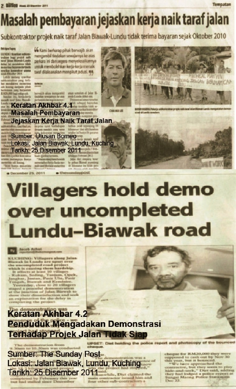“Lembaga Perolehan Persekutuan Sarawak (LPPS) pada Mesyuarat Lembaga Perolehan Persekutuan Sarawak Bil.9/2009 yang diadakan pada awal Ogos 2009 telah bersetuju menerima tawaran penender ini pada harga kontrak RM29.95 juta. Bagaimanapun, didapati kontraktor ini menghadapi masalah untuk membayar pasukan pembinaan sejak Oktober 2010 seperti dilaporkan dalam Utusan Borneo seperti di Keratan Akhbar 4.1. Selain itu, The Sunday Post pada 25 Disember 2011 melaporkan penduduk telah mengadakan demonstrasi terhadap projek yang tidak siap seperti di Keratan Akhbar 4.2.”