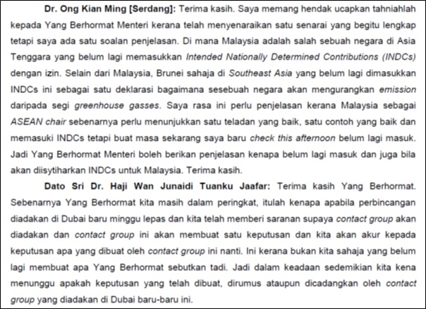 Najib’s lack of a leadership role in the climate change agenda is made more serious by the fact that the previous Minister of Natural Resources and Environment (NRE), G. Palanivel, was totally negligent in addressing key issues in the environmental agenda including GHG emissions. In my 2 years in parliament when he was a Minister, I did not see or hear him once answering a question pertaining to his Ministry or taking part in the important budget debates relating to his ministry. And I am not confident that the new Minister of Natural Resources and Environment (NRE), Wan Junaidi, has the necessary grasp of the key issues surrounding climate change and GHG emissions. When I questioned him on the 16th of November, 2015 as to why Malaysia was only one of two countries in South East Asia (the other being Brunei) which had not submitted its INDCs, he replied that Malaysia was still waiting for a decision to be made by a contact group that had met in Dubai the previous week. (See Appendix 1 below) Perhaps he didn’t realize that Malaysia’s own INDC is a domestically determined target that should be set based on parameters and factors within the country rather than to be dictated by a ‘contact group’ comprising of other unnamed nations. I am not sure what conditions this group set that were reflected in Malaysia’s INDC which was eventually released on the 27th of November, 2015. But I am almost certain that there was not much discussion about our INDC in the cabinet which had met earlier on the same day.