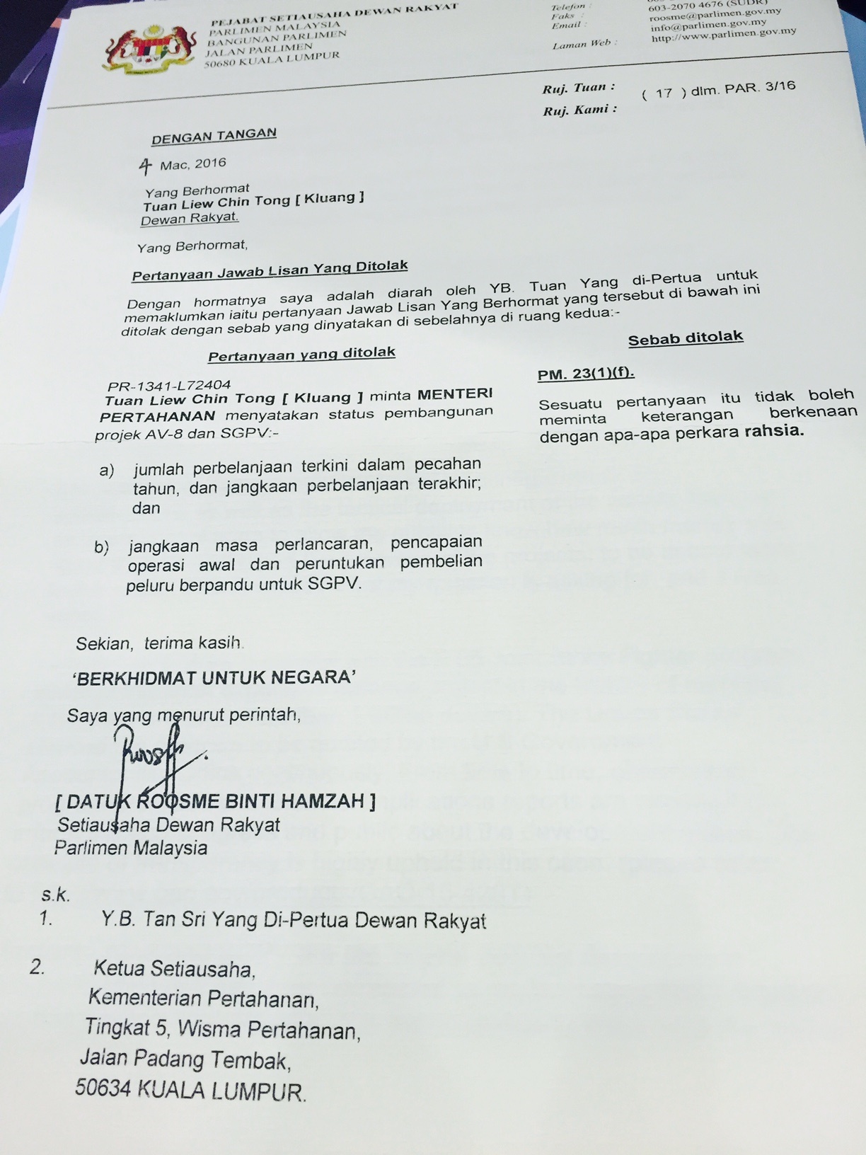 Yesterday, my parliamentary question on the expenditures of AV-8 (8×8 armored vehicle) and Second Generation Patrol Vessel (SGPV) projects was turned down because it was classified under the Official Secrets Act (OSA).