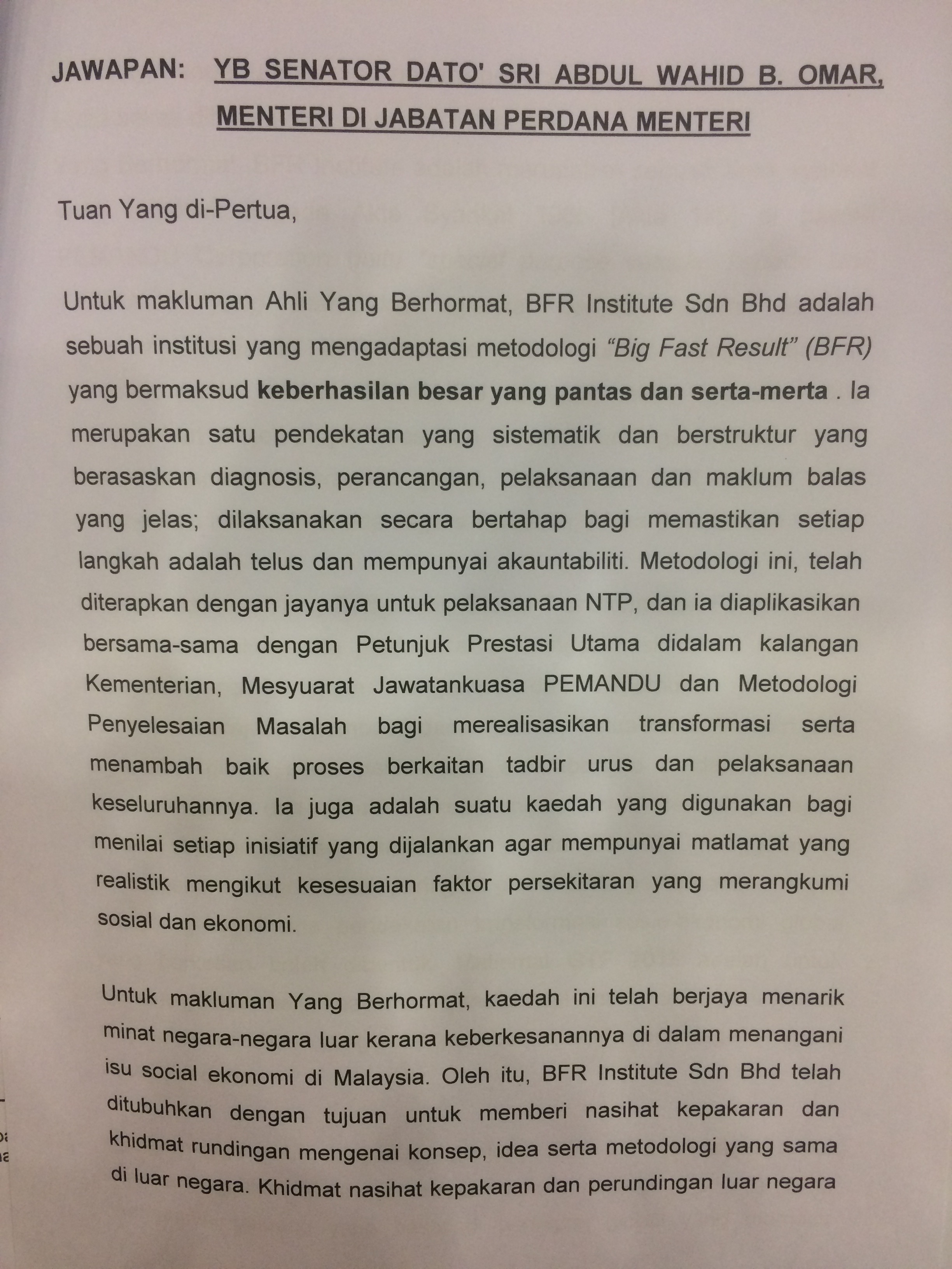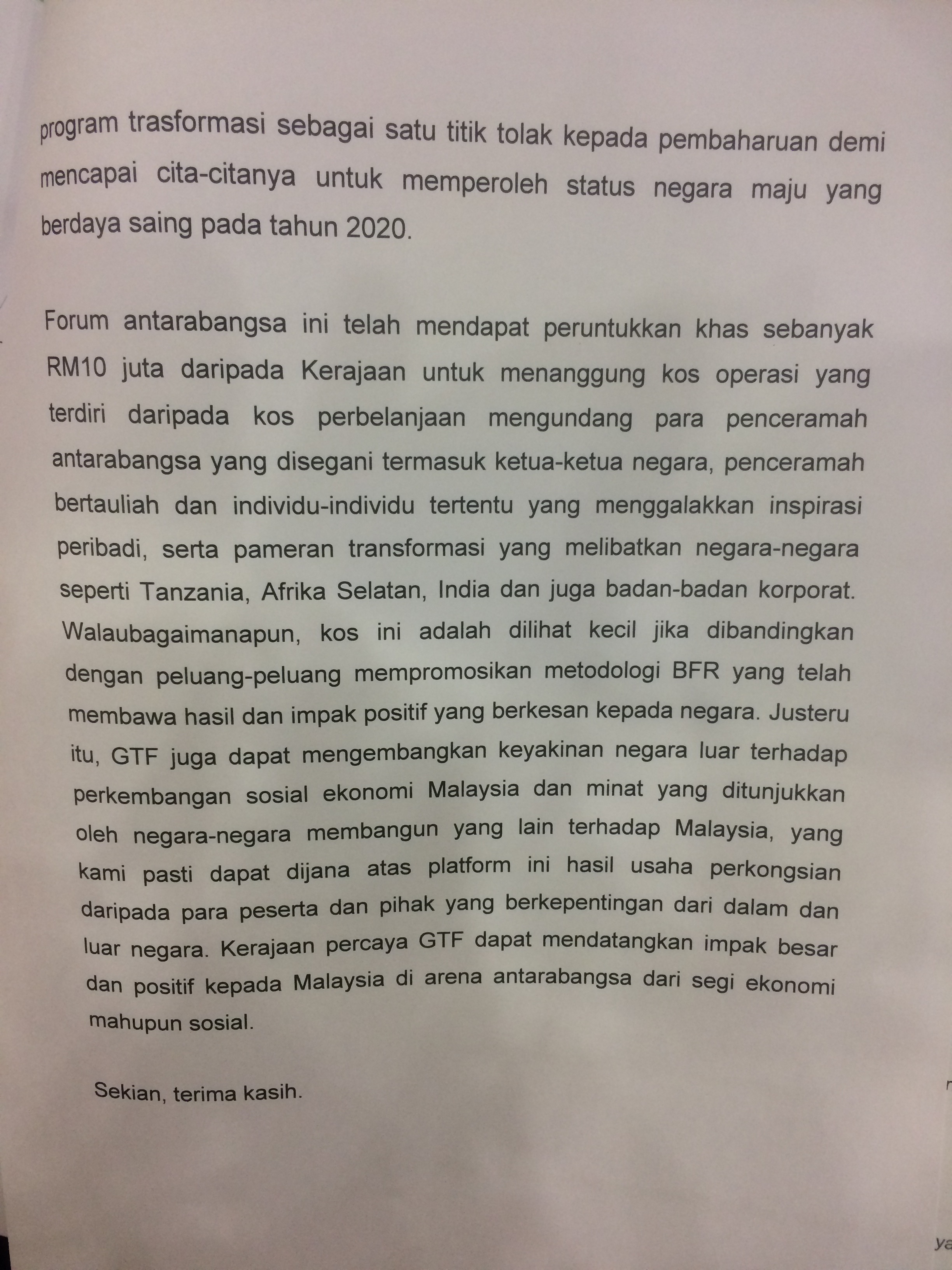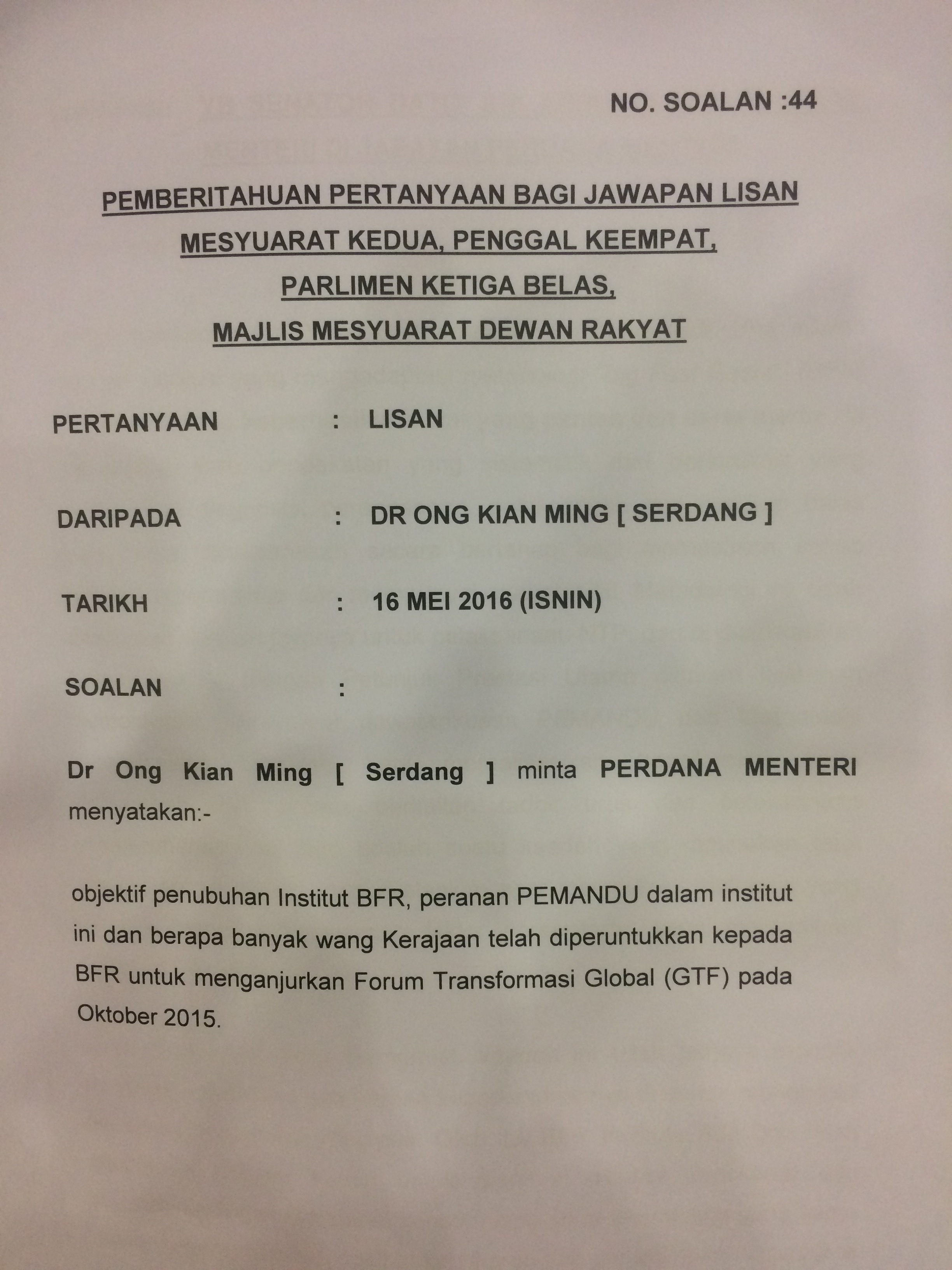 The BFR Institute[1] (BFR stands for Big Fast Results) organized its first Global Transformation Forum in October 2015.[2] One of the headline speakers invited to speak at this forum was Arnold Schwarzenegger, the former Governor of California, and Hollywood actor. In a reply to my parliamentary question dated 16th of May, 2016, it was stated that the government allocated RM10 million to BFR Institute to organize this forum. (See attachment 1, 2, 3, 4)