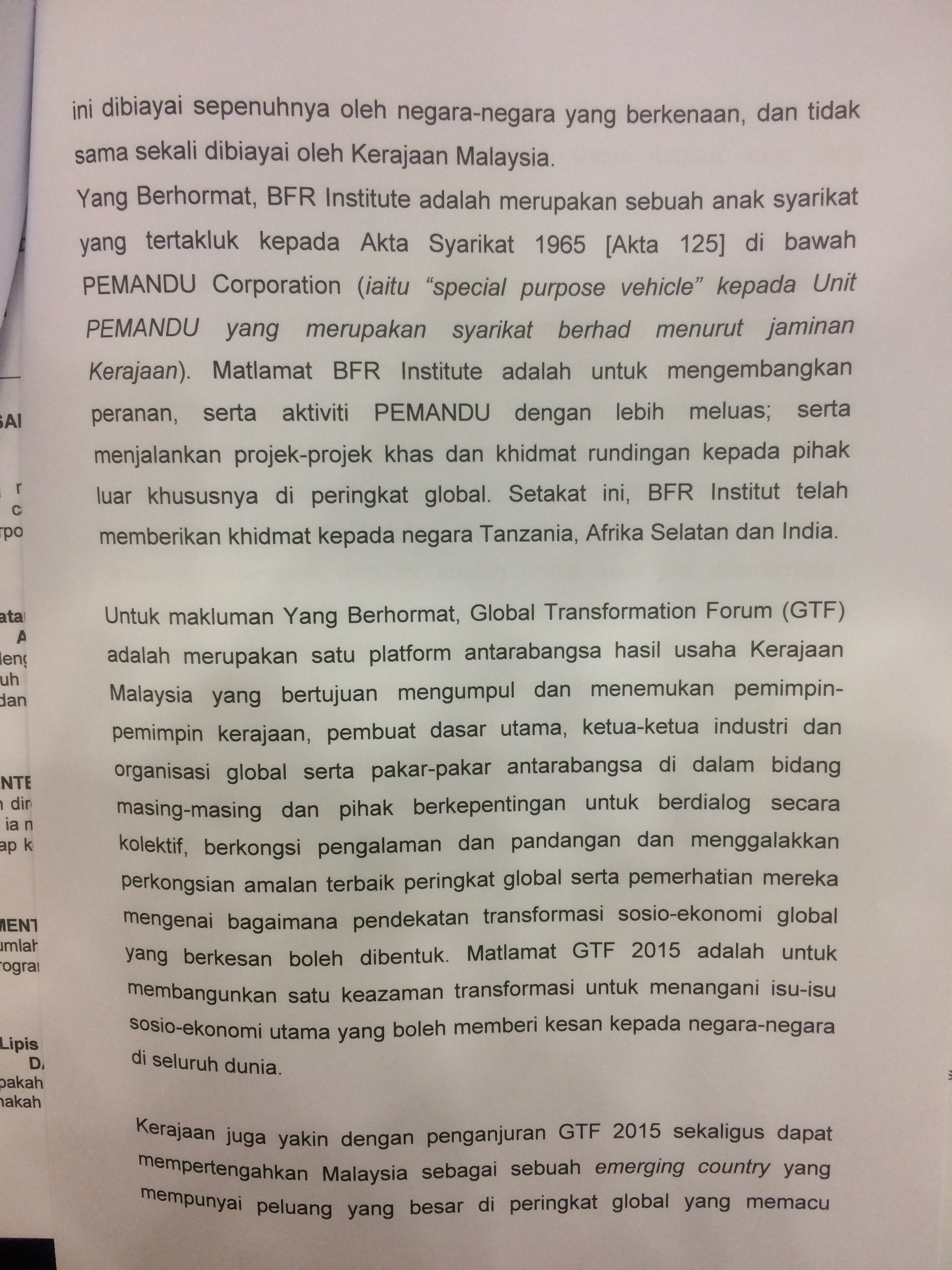 I call upon the Government of Malaysia to put an immediate stop to funding the activities of BFR Institute and for PEMANDU Corp to divest its 49% interest in BFR Institute so that any conflicts of interest between the government and the activities of BFR Institute as a private entity can be avoided.