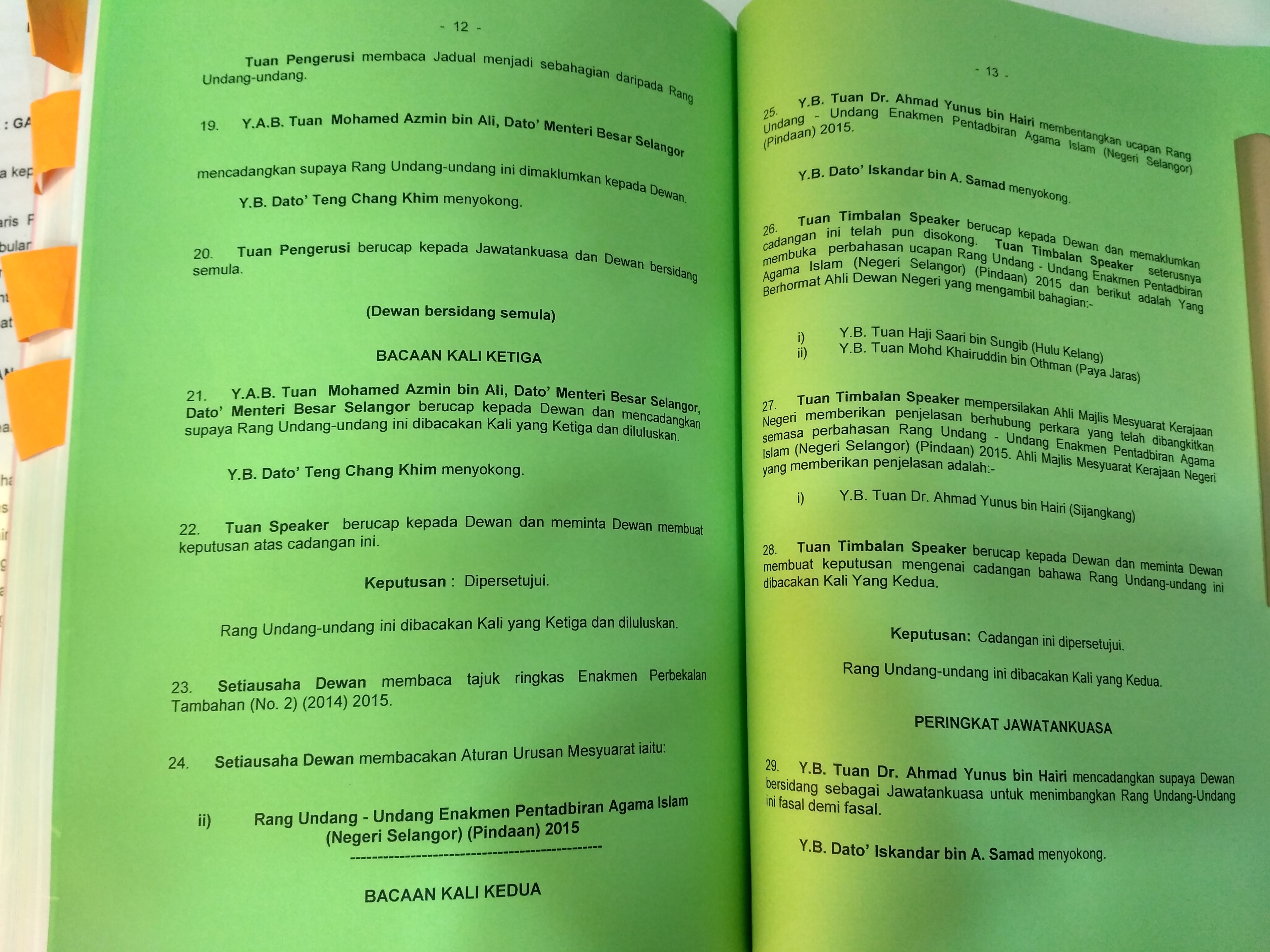Merujuk kepada minit mesyuarat sidang Dewan pada hari berkenaan, hanya dua orang ADUN sahaja yang mengambil bahagian dalam perbahasan RUU tersebut, iaitu YB Saari Sungib (ADUN Hulu Kelang) dan YB Khairuddin Othman (ADUN Paya Jeras). Di manakah ADUN Pembangkang daripada BN pada masa itu, jikalau mereka begitu prihatin dengan pemerkasaan institusi Mahkamah Syariah? Adakah benar Enakmen ini perlu dipinda lagi sedangkan pindaan terhadap Enakmen asal telah dibuat pada tahun lalu? Saya berharap agar ADUN Pembangkang daripada BN tidak memperalatkan institusi Mahkamah Syariah untuk kepentingan politik. (Sila rujuk Lampiran 3)