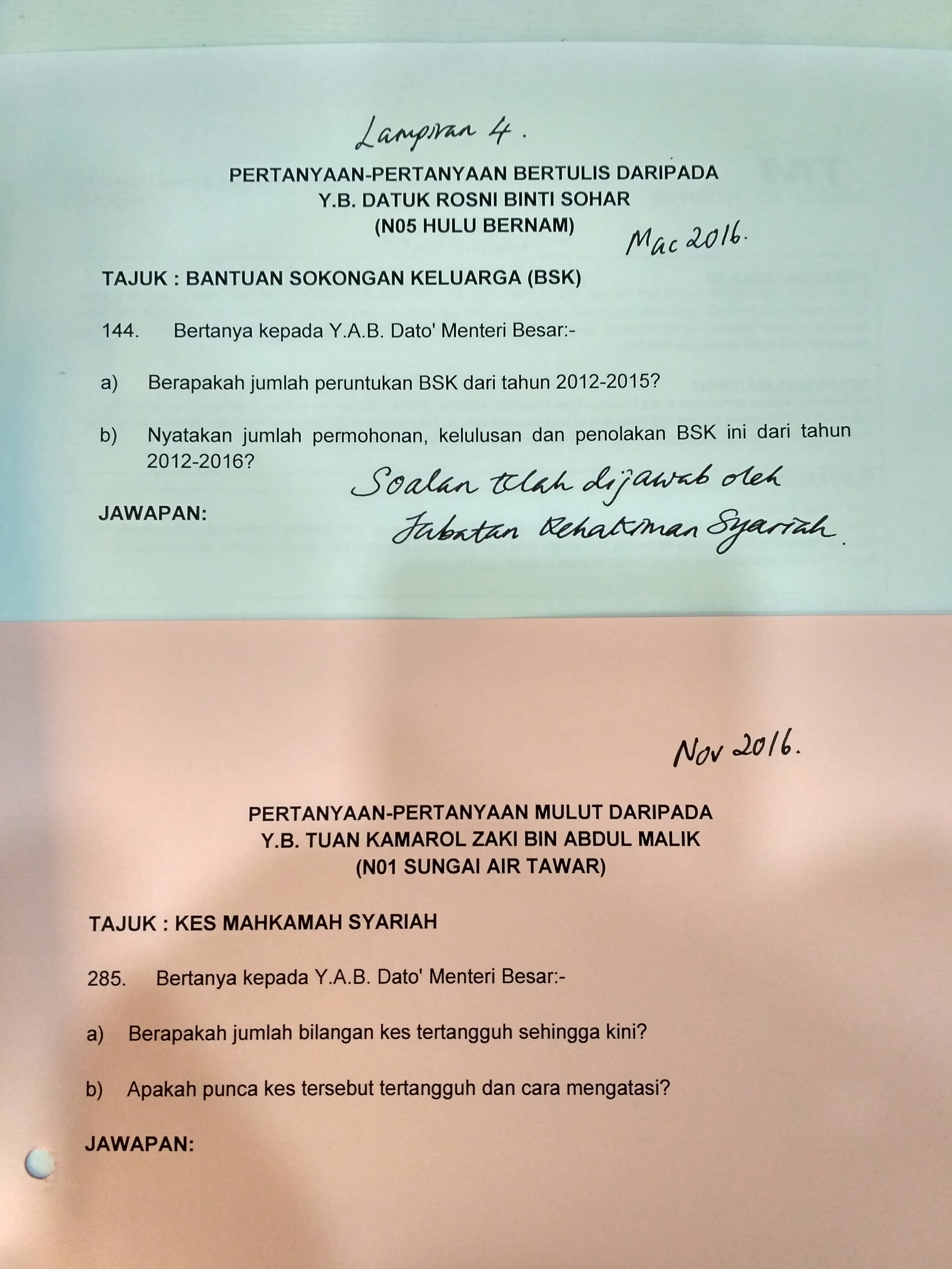 Lebih-lebih lagi, ADUN BN dari Sungai Air Tawar, Kamarol Zaki Abdul Malik juga ada membangkitkan isu yang sama dalam soalan lisannya ke-285 dalam sidang Dewan ini. ADUN-ADUN BN boleh bertanya soalan tambahan sekiranya soalan ini sempat dijawab. Apapun sekali, saya yakin jawapan bertulis tetap akan diberi kepada ADUN Sungai Air Tawar. (Sila rujuk Lampiran 4)