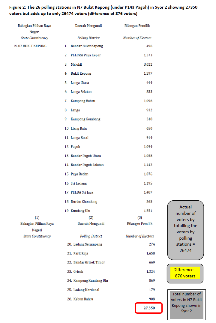 Figure 2: The 26 polling stations in N7 Bukit Kepong (under P143 Pagoh) in Syor 2 showing 27350 voters but adds up to only 26474 voters (difference of 876 voters)