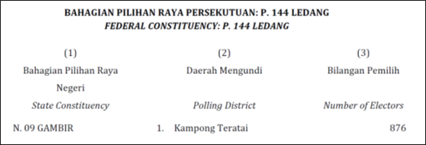 Figure 1: Kampong Teratai polling station with 876 voters in N9 Gambir under P144 Ledang in Johor, published in Syor 1 on the 15th of September, 2016