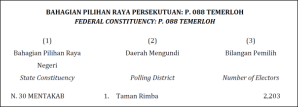 If the Election Commission had wanted to add in new polling stations, it must do so under Section 7 (2) of the Elections Act 1958. It cannot do so between Syor 1 and Syor 2 of the delimitation exercise. But this was exactly what the Election Commission did when it added in the new polling station of Taman Rimba in the state constituency of N30 Mentakab under the P88 Temerloh parliamentary constituency in Syor 2 (See Figure 4 below). Taman Rimba was not a polling station in Syor 1 of the delimitation exercise.