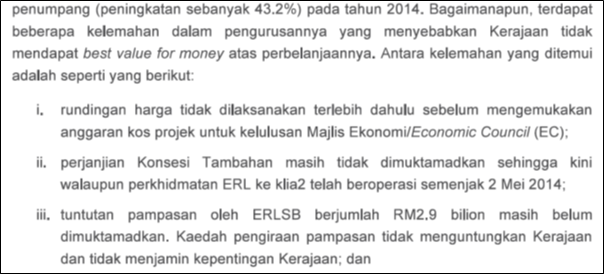 These are some of the reasons which led the Auditor General to conclude that the government did not get the ‘best value for money’ for the lopsided concession agreement with ERL Sdn Bhd.