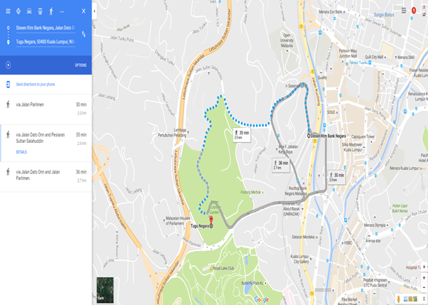 But this is not sufficient. For example, according to google maps, it takes 35 minutes to walk from the Bank Negara KTM station to Tugu Negara via the proposed pedestrian walkway showed in Figure 4 and 30 minutes to talk via Jalan Parlimen (See Figure 5 below).
