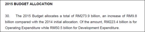 Firstly, PM Najib announced that the “Development Expenditure of RM48.5 billion for 2015 will be maintained and spent.”[1 – Eng Bm] This statement by PM Najib is highly confusing since in his 2015 Budget Speech, the development expenditure was announced to be RM50.5 for 2015.