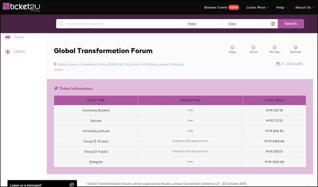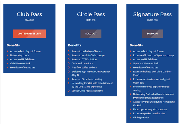 For GTF 2015, ticket prices started at RM427 for a university student and went up to a maximum of RM1424 for a regular delegate (Figure 1). For GTF 2017, ticket prices were jacked up to a starting price of RM4,000 and went up to a maximum of RM10,000 (Figure 2).