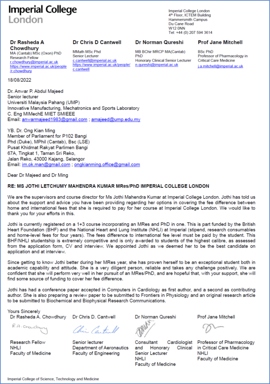 Jothi Letchumy[4] (her real name) recently completed her master’s in biomedical research[5] in the field of cardiac and vascular medicine at Imperial College, London. She received a scholarship from Imperial which covered her room and board and I assisted her in obtaining additional funding and scholarship, with the help of the Minister of Higher Education (MOHE), Dr Noraini Ahmad, to cover her tuition fees.[6] Jothi who hails from Penang, is from a B40 family and against many odds, including a challenging single parent environment growing up, succeeded in graduating with a Masters degree from the University Malaysia of Pahang (UMP), winning many awards and recognition along the way. She is a wonderfully positive person and an extremely hard worker. Unfortunately, despite doing very well in her research work at Imperial College, she is still in need of funding to continue her PhD studies at the same institution (Appendix 3). I will continue to assist where I can. But will Jothi be able to secure funding from a sponsoring institution in Malaysia so that she can return to build up research capabilities back in Malaysia after she completes her PhD?