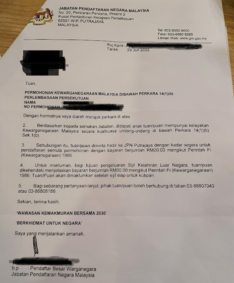 Dr Jasmine Yip is a dental specialist who used to serve in a health clinic (“klinik kesihatan”) in Bangi. She married a Taiwan national while she was studying and undergoing her dental training at the Taipei Medical University. Her daughter was born in Taiwan in 2017. Since then, she has been trying, unsuccessfully, to apply for Malaysian citizenship for her daughter. She returned home to Malaysia and was serving as a Dental Officer with the Ministry of Health. During this time, she was also busy taking care of her daughter who has eczema and applying to the Ministry of Home Affairs for her daughter’s citizenship. And she was so close. We suspect that she was one of the 33 successful applicants that was highlighted in the parliamentary reply to the MP from Sekijang, my colleague Puan Hajah Natrah Ismail. And she was even asked to pay RM30 by the National Registration Department (NRD) for her daughter’s birth certificate (Appendix 1). But her efforts were denied when the Court of Appeal, on the 5th of August 2022, overturned the High Court ruling that children born to Malaysian mothers overseas were entitled to Malaysian citizenship.[2] I was with Dr Yip at the NRD office in Putrajaya when the officer in question said that he was not allowed to hand over Dr Yip’s daughter’s birth certificate because of the CoA ruling. Dr Yip has since resigned from her position at MoH and is now back in Taiwan with her daughter and her husband. Will she return to Malaysia to collect her daughter’s Malaysian citizenship papers one day?