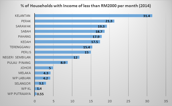 The same Household Income and Basic Amenities Survey also shows Perak having the 2nd highest number of households earning less than RM2000 a month at 21.3% (after Kelantan at 31.4%) (See Figure)