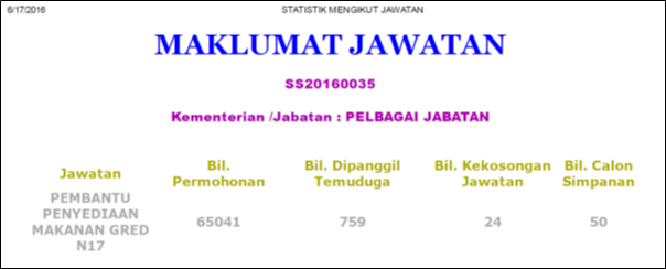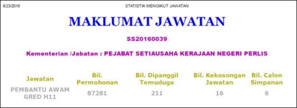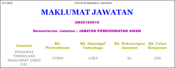 [2] http://online.spa.gov.my/online/index.php. It is possible that some of the applicants would have applied for multiple jobs thereby inflating the application statistics e.g. people who apply for the N41, N17 and even N11 jobs. If this was the case, it would only highlight the lack of opportunity in the job market if even those who are qualified to apply for graduate level entry positions would also want to apply for positions which only require a SPM or PMR qualification.