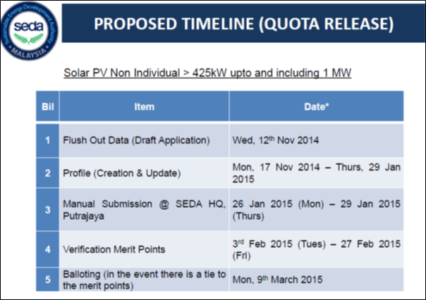 However, SEDA did not announce the allocation of FiT quotas for Solar PVs >425kW to 1MW for non-individuals at yesterday’s open ballot. Last year, SEDA had told industry players that applications for the FiT quota >425kW to 1MW would be evaluated by SEDA using a merit point system.[2] In the same presentation last year, SEDA also said that if there were any ties in the number of points scored by the applicants, a similar open ballot would be conducted yesterday for the FiT quotas above 425kW (See Appendix 1 below). But sadly, no such ballot was conducted yesterday.