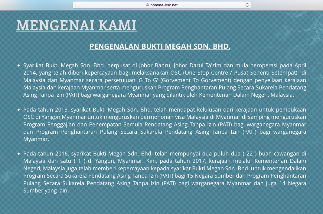 Bukti Megah Sdn. Bhd. is a relatively new company. According to its website, the company started operation in April 2014. Yet, the company has been appointed as One-Stop Centre by the Home Ministry to process application for migrant workers from Myanmar. (Attachment 1)