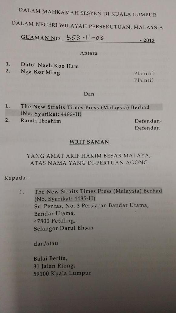 - Berita Harian news daily had falsely and maliciously accused us of logging and polluting the rivers in Kelantan at the end of 2012 and we have filed a defamation suit against the writer and The New Straits Times Press (Malaysia) Berhad, the latter being the owner and publisher of Berita Harian. The case has been fixed for full hearing at the Sessions Court in Kuala Lumpur in March 2015.