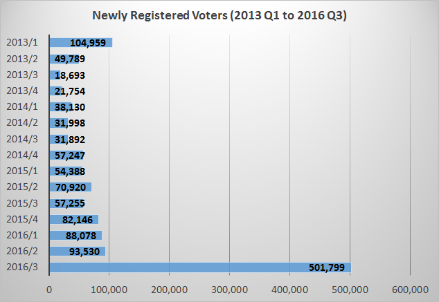 Figure 1: Number of newly registered voters by quarter, Q1 2013 to Q3 2016