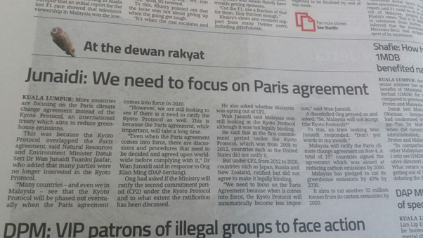 In his verbal reply to me in parliament, the Minister said that the focus should be on the Paris Agreement instead of the Kyoto Agreement. (The clip of his verbal reply can be found here on youtube: https://www.youtube.com/watch?v=6mlFP-i7cQQ&feature=youtu.be). His reply was given coverage in the Star newspaper the following day (See attached)