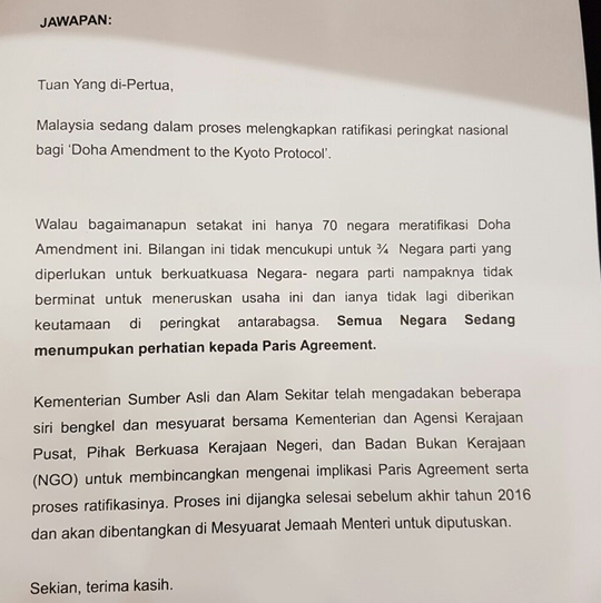 In the parliamentary question and answer session on Tuesday, 25th of October, 2016, I asked the Minister of Natural Resources and Environment to explain when the government will ratify the 2nd commitment period (CP2) of the Kyoto Protocol also known as the Doha Amendment.[1]