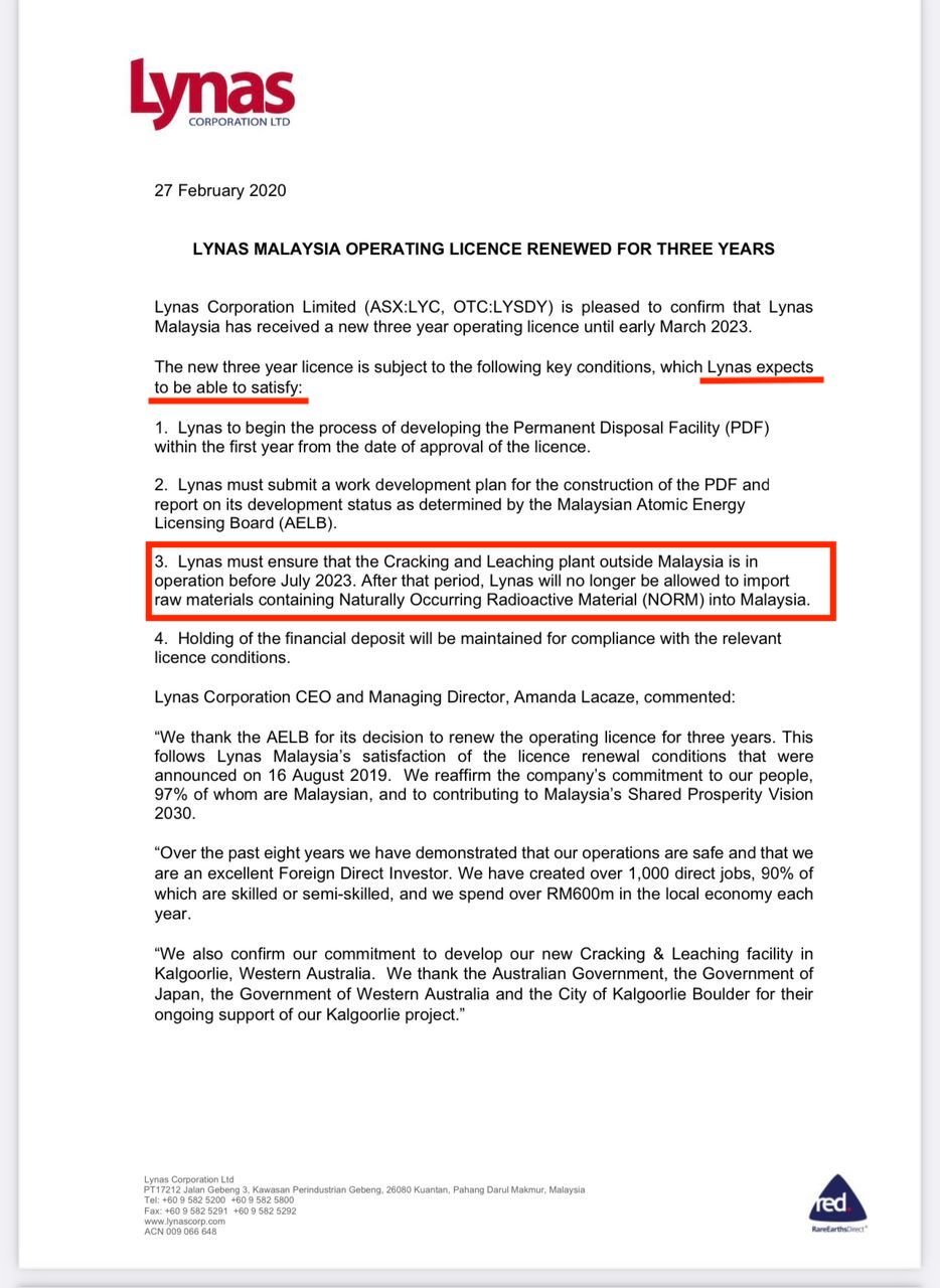Three years later, from its series of recent statements, Lynas is again fighting very hard to be escaped from the condition imposed on them and that they had announced “to be able to satisfy” in 2020.