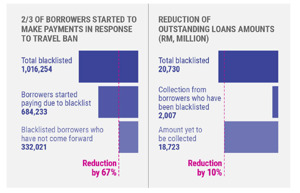 There were other ideas put on the table including mandatory monthly salary deductions, harsher enforcement measures against the hardcore defaulters, passport and drivers license restrictions against loan defaulters (as an alternative to the very successful but not very popular travel ben – see Figure 2 below), requiring a family member to a guarantor for the borrower, removal of the first-class honours waiver or replace it with a partial waiver, reduction of loans (with sufficient notice) and discontinue loans to low-rated and non-rated private institutions and courses, increase the current 1% Ujrah loan (because borrowing costs and costs of funds are higher than the repayment interest rates), just to mention a few.