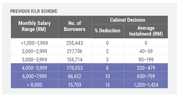 On hindsight, what should have been proposed was an ICLR that was more gradual according to larger income brackets and to have implemented this only for NEW PTPTN recipients rather than EXISTING borrowers because new borrowers would know about the ICLR right from the start and not be shocked by higher repayment rates if they were to earn a higher salary soon after graduating. They could then plan their finances accordingly including servicing their car loans, their mortgages (if any), and their other monthly fixed expenses.