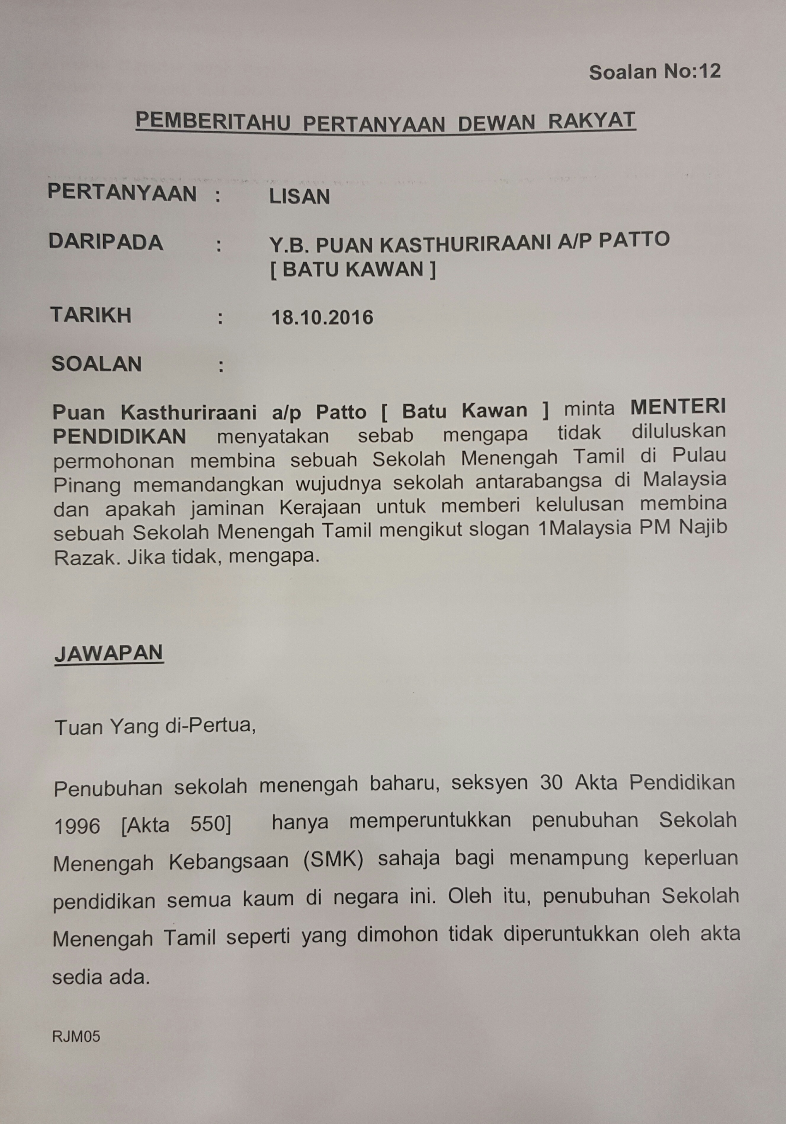 I refer to a Parliamentary reply given by the Ministry of Education on 18 October 2016 towards my question on the building of the first Tamil secondary school on Malaysian soil after 59 years of independence. The reply stated that in accordance with the provisions of Section 30 (1) of the Education Act 1996 (Act 550) only allows for the establishment of a Sekolah Menengah Kebangsaan (SMK) to cater for the educational needs of children of all ethnicities. The Ministry stated that establishing a secondary Tamil school as per request is nowhere in the provision of the Education Act 1996.